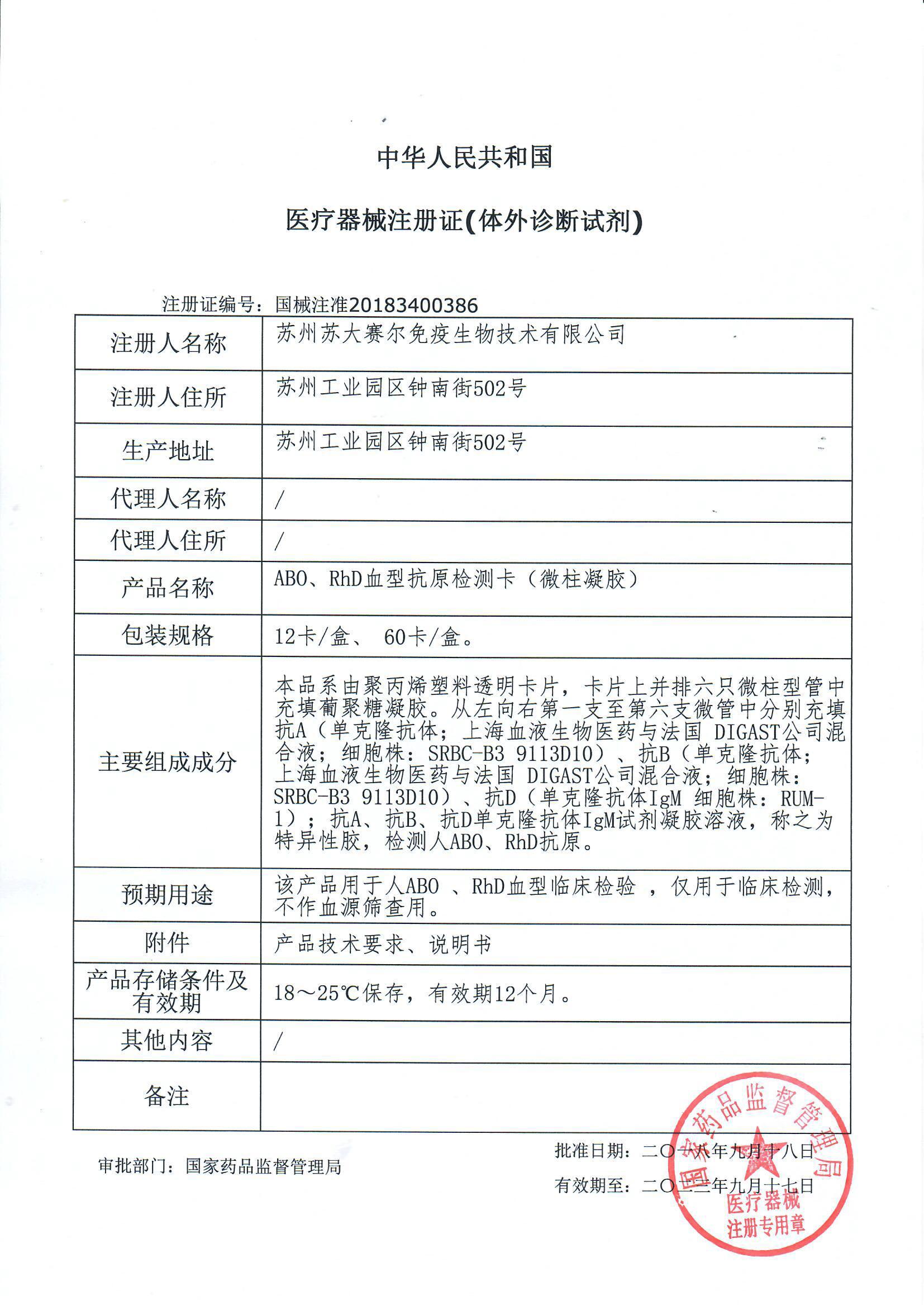 苏大赛尔ABO,RhD血型抗原检测卡(微柱凝胶)取得医疗器械注册证